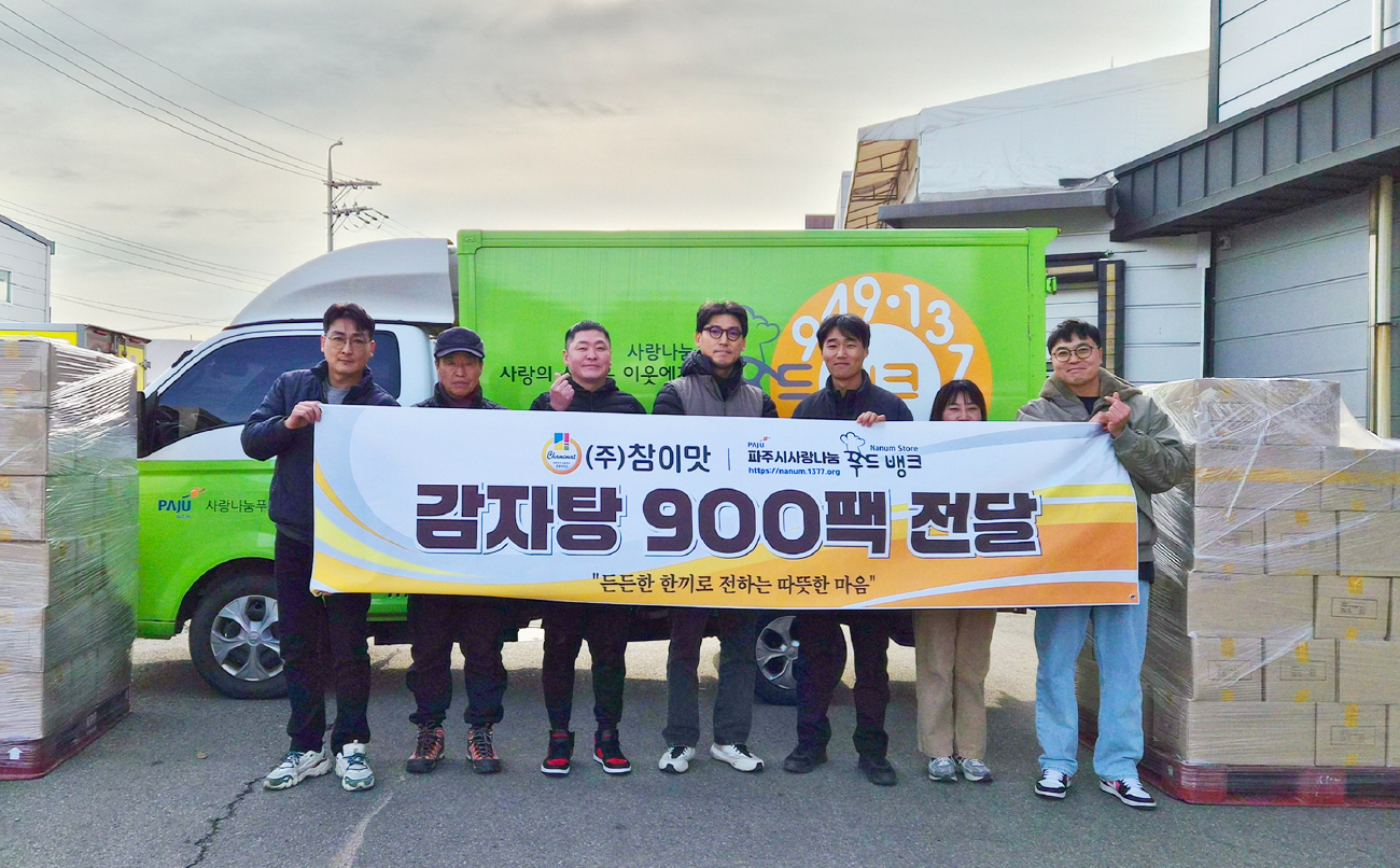 주식회사 참이맛(대표이사 문정미)과 참이맛감자탕 행신본점(사장 조혜영)은 지난 12월 2일 파주시 신촌동 참이맛 감자탕 생산 현장에서 파주사랑푸드뱅크(대표 김백현)에 문산읍의 어려운 이웃들을 위해 써달라며 감자탕 900팩을 전달했다.